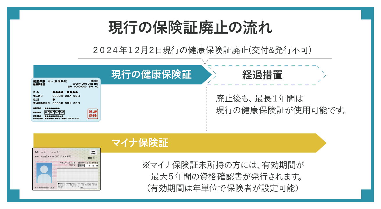 経過措置として、現行の保険証廃止後も最長1年間は使用できるため、期間中はマイナ保険証と現行保険証の両方が使え、利用者が保険証を選択できる状況です。しかし、12月2日以降は現行保険証は新規発行や再発行が停止されるため、利用できるのはマイナ保険証のみとなります。